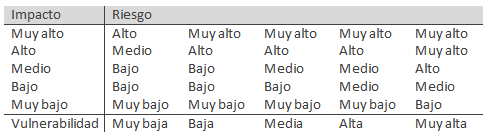 - Riesgo calculado: se define en torno a los valores calculados de vulnerabilidad y el impacto producido y es solo un indicador que ayuda a tomar una decisión.