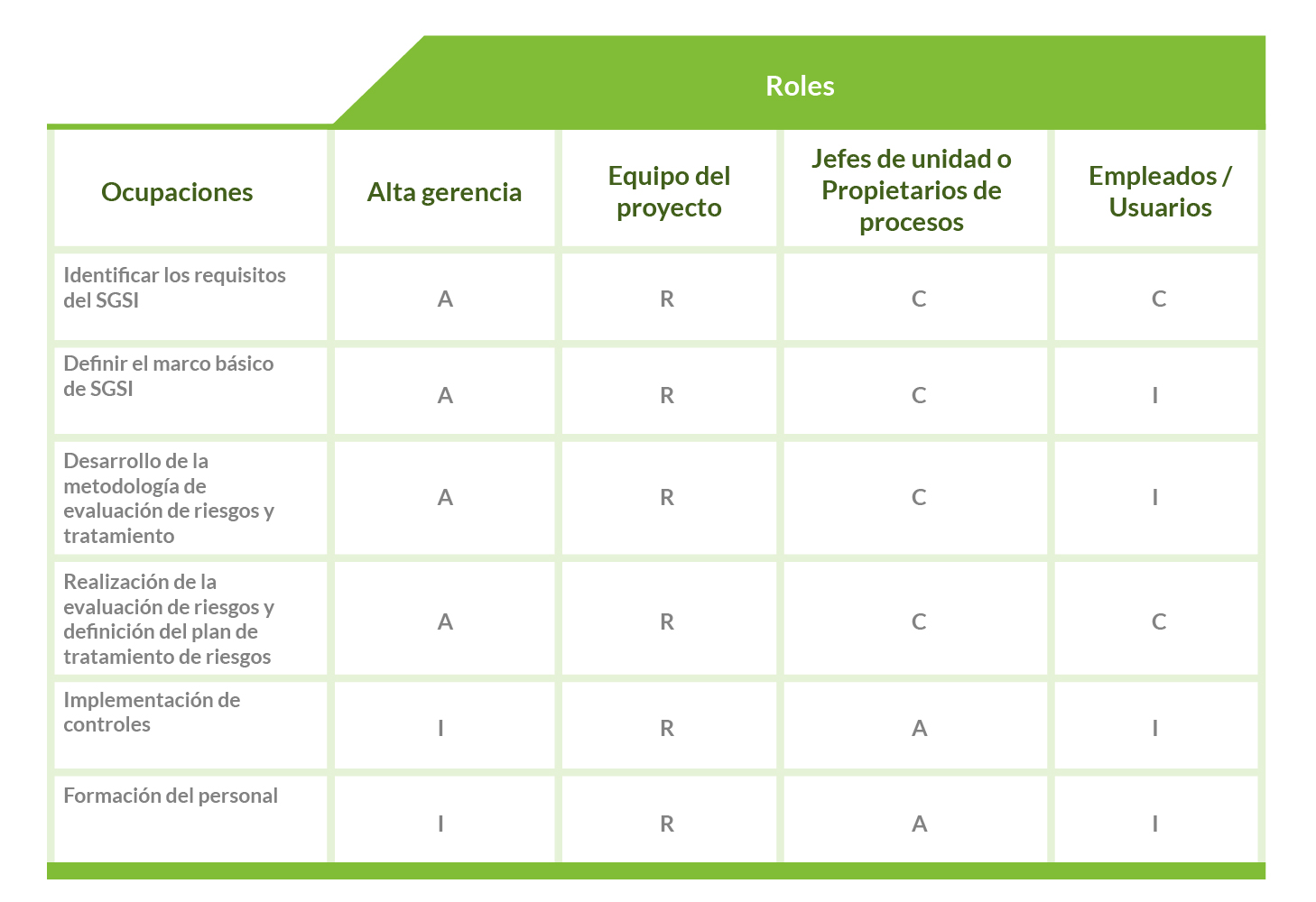 De forma independiente la metodología que se está usando para la implantación de la norma ISO 27001, dicha matriz puede proporcionarle una visión general clara de todas las responsabilidades.